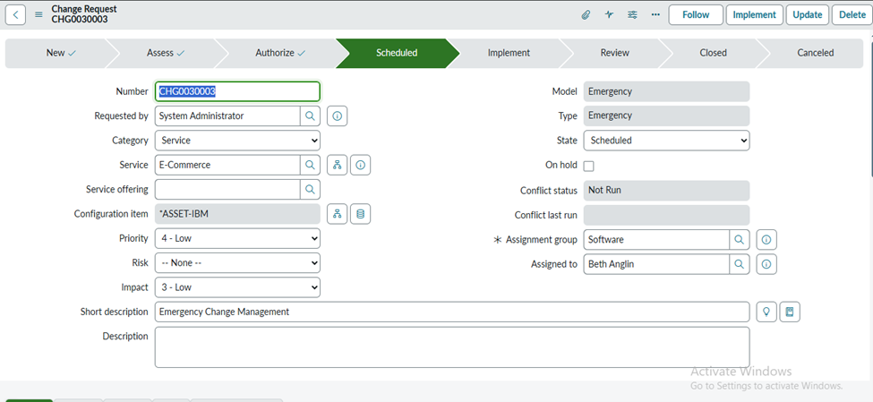 Current status of the change (New, Assess, Authorize, Scheduled, Implement, Review, Closed). |