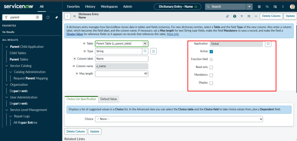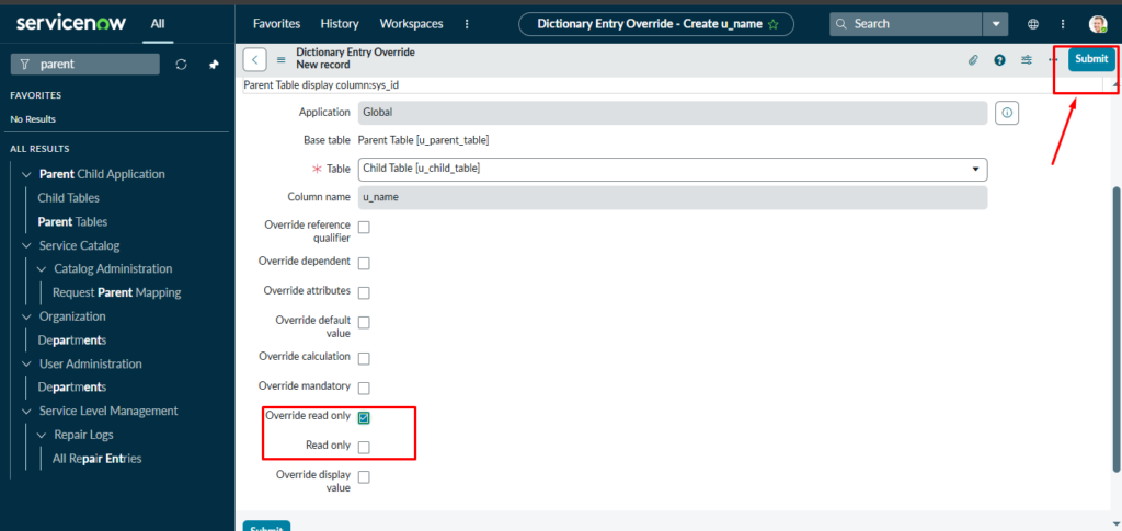 Go to Parent table fields à Configure Dictionary à In Right side, their option for doing Read only, Mandatory, Display.