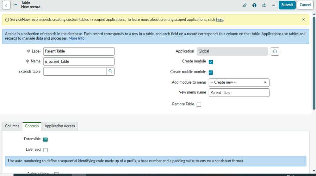 for Making Child Table We Have Click on Extensible. à Controls à Extensible Click on Box & Submit it, Your Table will be made which is Parent Table.
