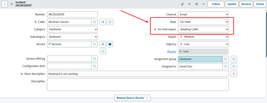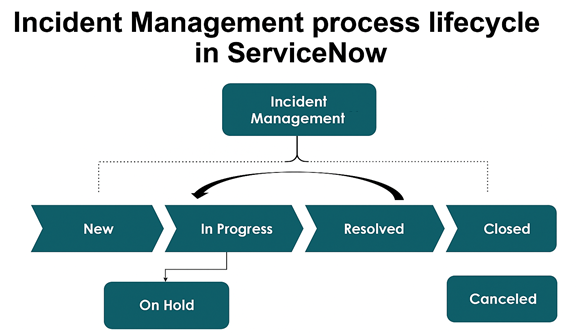 On Hold: The On-Hold state in incident management is a temporary status where the incident resolution is suspended because the team is waiting for necessary action from the caller. In the On Hold state, the on-hold reason field is mandatory.