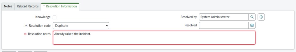 Resolved: The incident considered to be resolved when the service has been resolved to its normal state. The two fields are mandatory to fill.