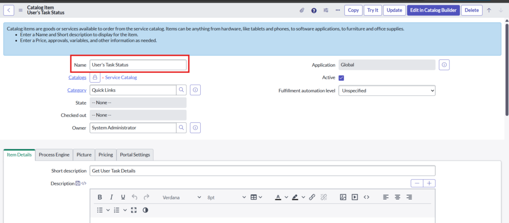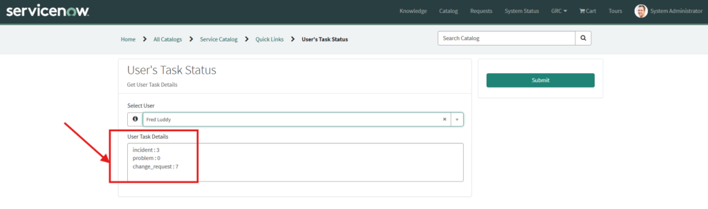 This script will get the value of the user from the catalog item. Also, once we select the user on catalog item, it will fetch the assignment details and that details will be populated in the ‘User Task Details’ field.