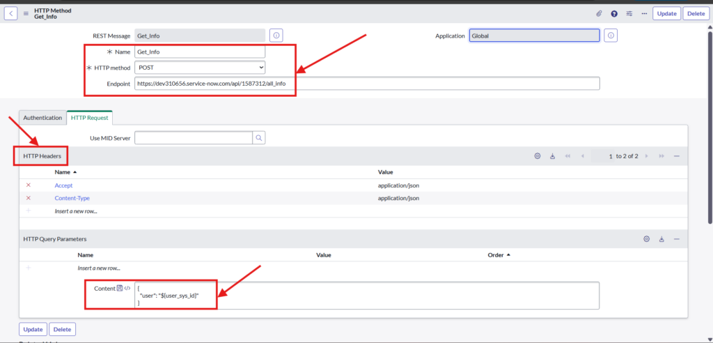 Select HTTP method, Endpoint, HTTP Headers and Query Parameters