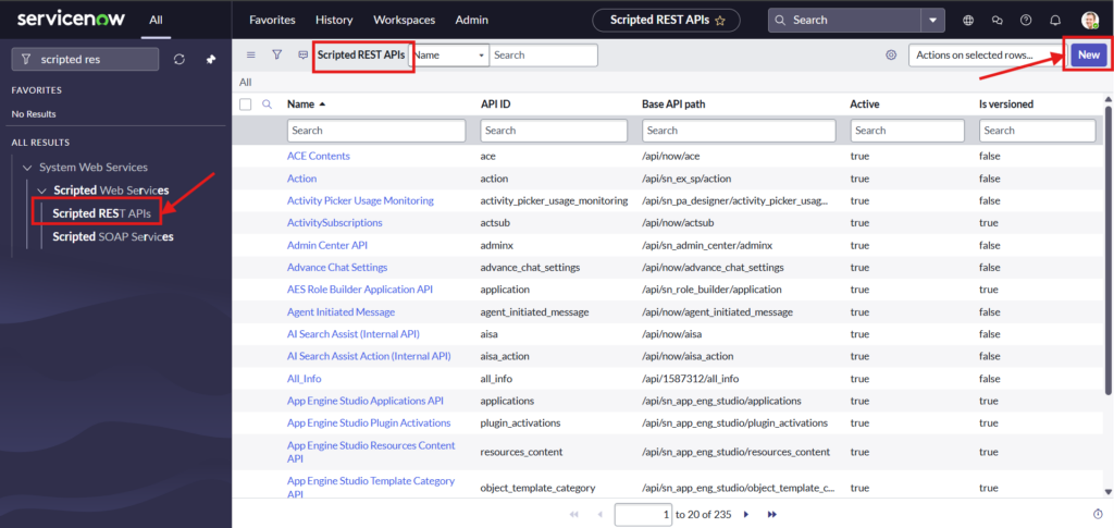 Navigate to ALL > System Web Services > Scripted REST API’s > New